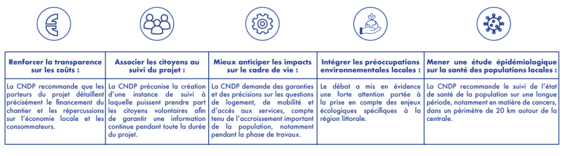 A l’issu de ce débat, la CNDP a formulé dans un compte-rendu 30 recommandations à destination des porteurs du projet (EDF et RTE), mais aussi de l’État, d’autres acteurs du nucléaire ainsi que des acteurs locaux (comme la région, les collectivités, la CUD, le GPMD,…). Voici, en quelques mots, une partie des recommandations de la CNDP :